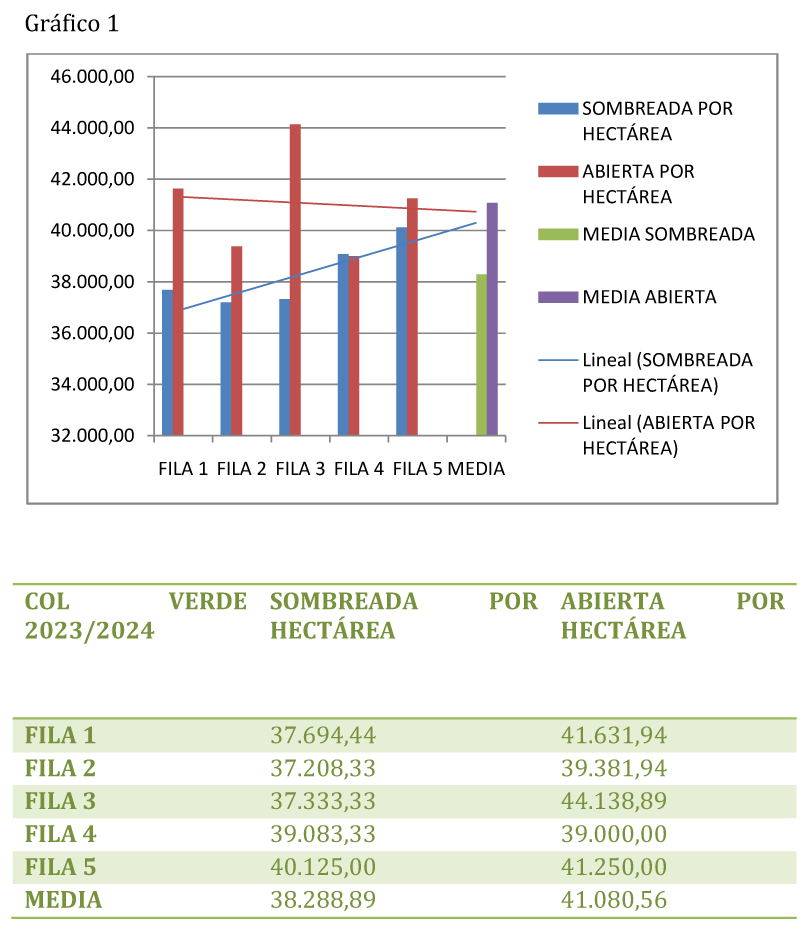 La producción se ha calculado en kilogramos por hectárea de fruto maduro para homogeneizar y así comparar el grado de sombra en cada una de las filas, siendo la fila 1 la que más horas de sombra a tenido y la fila 5 la que más horas de insolación. Dado que el propósito es analizar el total de producción se ha realizado una media de la misma comparando con la misma producción en la misma tierra pero en cultivo tradicional.