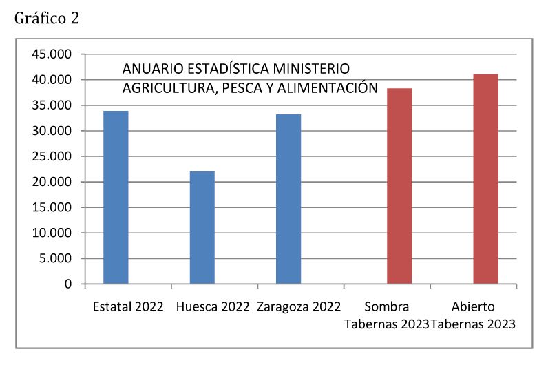 Por último se ha realizado una comparativa con los datos del Anuario Estadística del Ministerio de Agricultura, Pesca y Alimentación estableciendo una comparativa con los datos publicados para los años 2020-2021-2022 obteniendo una media de los mismos. En gráfico 1 se aprecian diferencias entre las dos formas de cultivo en torno al 8% aunque analizado por filas se puede apreciar que la sombra perjudica a la producción rondando el 10% en las primeras filas y equilibrándose la misma en las filas 4 y 5, filas de menor sombra.