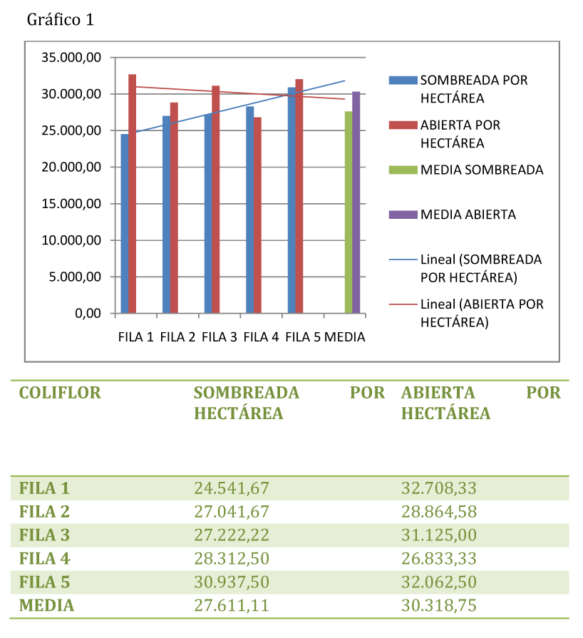 La producción se ha calculado en kilogramos por hectárea de fruto maduro para homogeneizar y así comparar el grado de sombra en cada una de las filas, siendo la fila 1 la que más horas de sombra a tenido y la fila 5 la que más horas de insolación. Dado que el propósito es analizar el total de producción se ha realizado una media de la misma comparando con la misma producción en la misma tierra pero en cultivo tradicional, sin sombra.