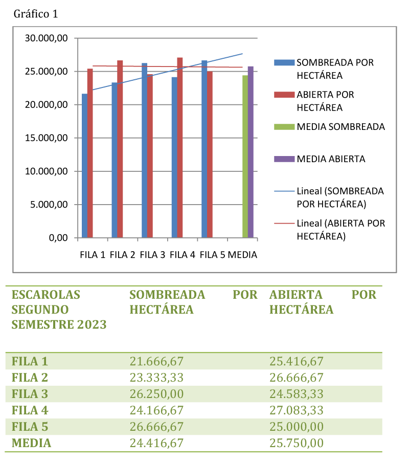La producción se ha calculado en kilogramos por hectárea de fruto maduro para homogeneizar y así comparar el grado de sombra en cada una de las filas, siendo la fila 1 la que más horas de sombra a tenido y la fila 5 la que más horas de insolación. Dado que el propósito es analizar el total de producción se ha realizado una media de la misma comparando con la misma producción en la misma tierra pero en cultivo tradicional.