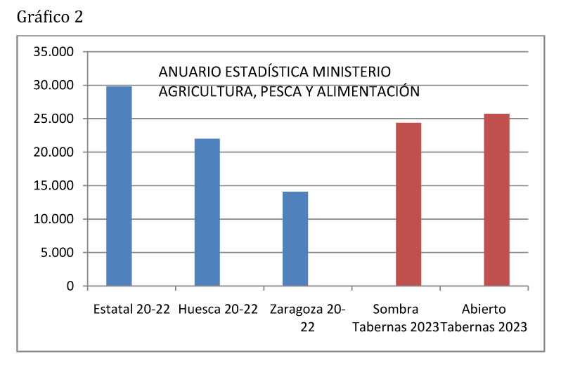 Por último se ha realizado una comparativa con los datos del Anuario Estadística del Ministerio de Agricultura, Pesca y Alimentación estableciendo una comparativa con los datos publicados para los años 2020-2021-2022 obteniendo una media de los mismos. En gráfico 1 se aprecia que la producción media en ambas superficies es muy similar no apreciando grandes diferencias ya que no difiere en más de un 5% aunque sí se notan mayores diferencias en las primeras filas, mucho más sombreadas, que llega casi al 15% en la fila 1. Sin embargo sí se notan grandes diferencias entre las diferentes filas sombreadas, a mayor cantidad de insolación en el otoño-invierno mayor es la producción.