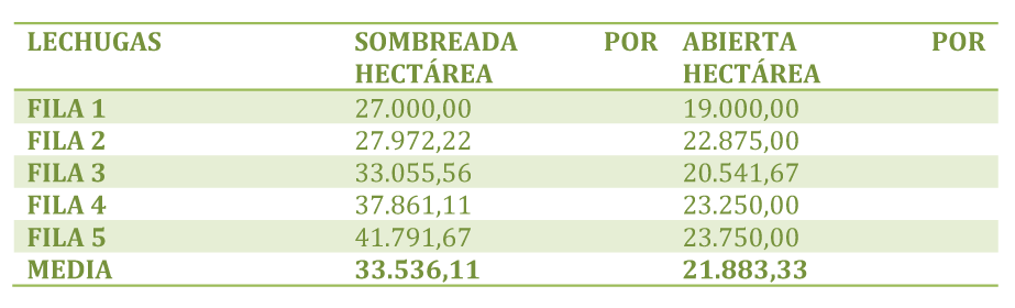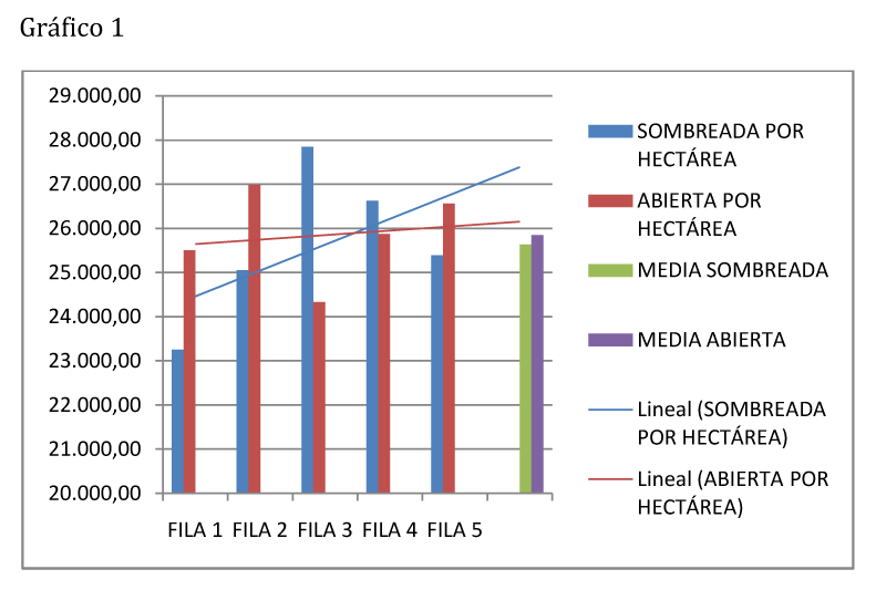 La producción se ha calculado en kilogramos por hectárea de fruto maduro para homogeneizar y así comparar el grado de sombra en cada una de las filas, siendo la fila 1 la que más horas de sombra a tenido y la fila 5 la que más horas de insolación. Dado que el propósito es analizar el total de producción se ha realizado una media de la misma comparando con la misma producción en la misma tierra pero en cultivo tradicional sin sombra