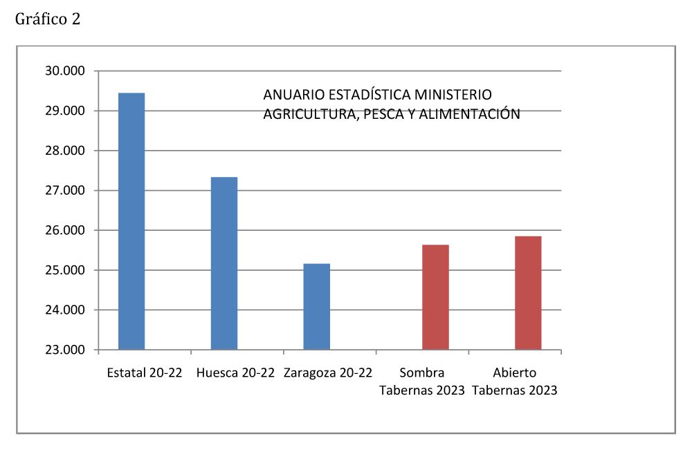 Con respecto a la comparación con los datos estatales y provinciales vemos que la producción abierta no está en consonancia con la producción de la finca de Tabernas siendo mucho más similar a la media de la provincia de Zaragoza pudiendo deberse a factores climáticos. En cualquier caso sería necesario ampliar la serie histórica de la producción de la finca de Tabernas para estudiar más a fondo las diferencias de producción.
