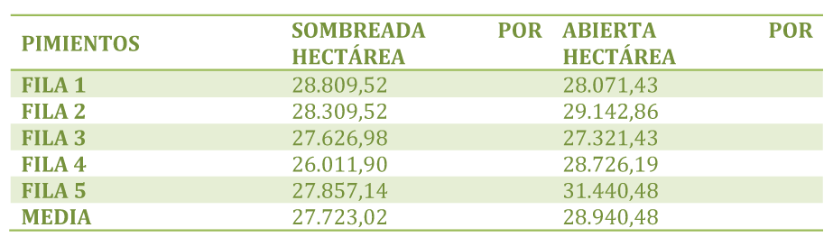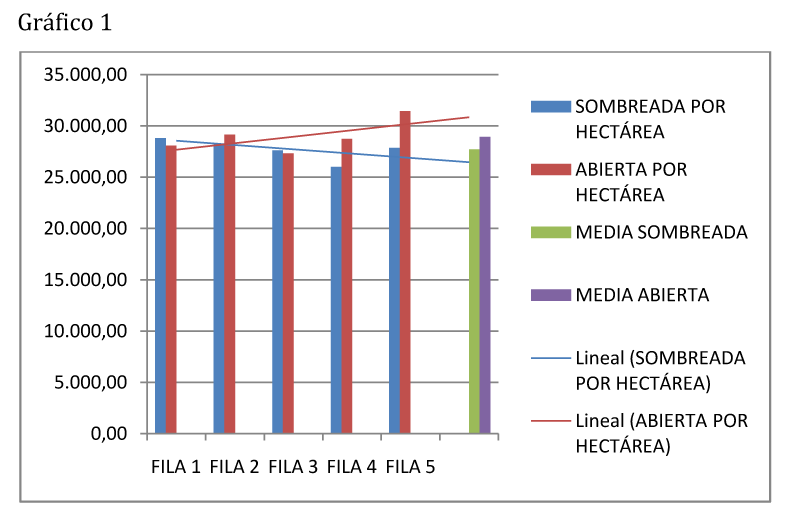 La producción se ha calculado en kilogramos por hectárea de fruto maduro para homogeneizar y así comparar el grado de sombra en cada una de las filas, siendo la fila 1 la que más horas de sombra a tenido y la fila 5 la que más horas de insolación. Dado que el propósito es analizar el total de producción se ha realizado una media de la misma comparando la misma producción en la misma tierra pero en cultivo tradicional, sin sombra, a pleno sol.