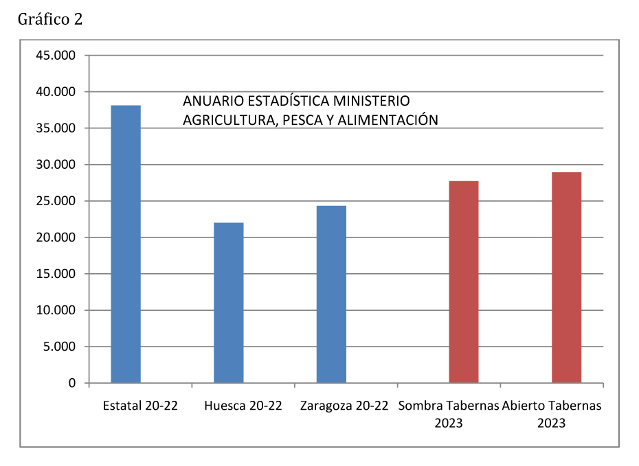 Por último se ha realizado una comparativa con los datos del Anuario Estadística del Ministerio de Agricultura, Pesca y Alimentación estableciendo una comparativa con los datos publicados para los años 2020-2021-2022 obteniendo una media de los mismos. En gráfico 1 se aprecia que la producción media en ambas superficies es muy similar no apreciando grandes diferencias ya que no difiere en más de un 5%. No se notan grandes diferencias entre las diferentes filas sombreadas por lo que un mayor número de horas de sombreado no afecta a la producción.